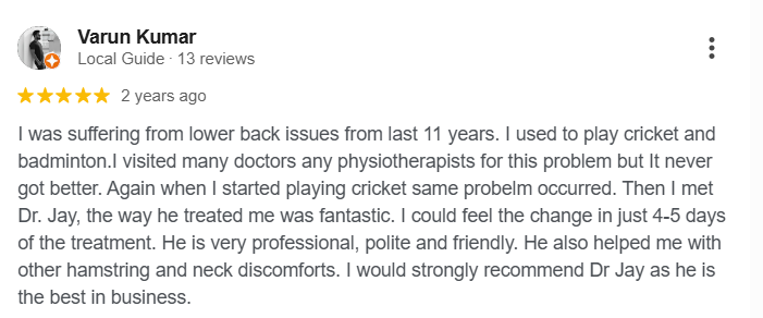 November 12, 2025Highlight successful pain reduction, improved mobility, and better daily function through skilled therapists using effective techniques. Special thanks to Jay Yadav. ( Best for Sports Person)